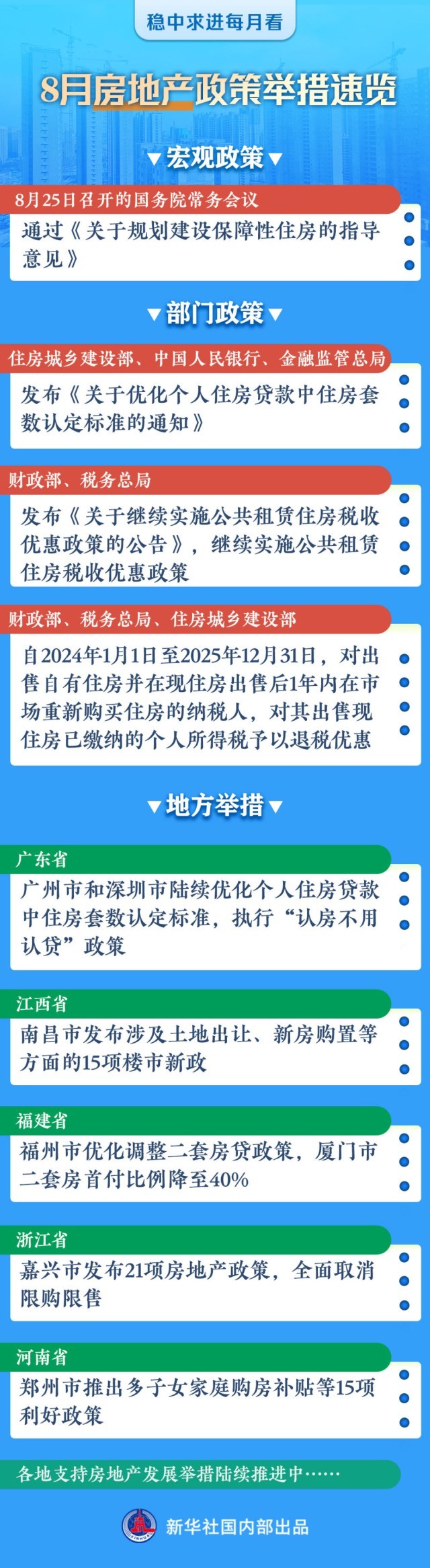 近段時間,相關部門陸續(xù)釋放地產(chǎn)領域積極政策信號:8月初,中國人民銀行在部署下半年工作時明確提出“繼續(xù)引導個人住房貸款利率和首付比例下行”;近日,住房城鄉(xiāng)建設部等三部門給出了“認房不認貸”政策具體實施標準;財政部還公布了兩項針對房地產(chǎn)市場的稅收優(yōu)惠政策。