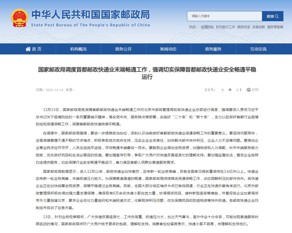 國家郵政局?jǐn)?shù)據(jù)顯示,進(jìn)入12月以來,郵政快遞業(yè)加快復(fù)蘇,迎來新一輪業(yè)務(wù)高峰,目前全國單日攬收量保持在3.6億件以上。快遞業(yè)迎來新一輪業(yè)務(wù)高峰,末端投遞壓力較大。為保障寄遞渠道的暢通,國家郵政局持續(xù)推進(jìn)保通保暢工作,動(dòng)態(tài)疏解積壓的郵件快件。各快遞企業(yè)正在加快統(tǒng)籌全網(wǎng)資源,保障平穩(wěn)渡過業(yè)務(wù)高峰。目前,全國大部分地區(qū)堵點(diǎn)卡點(diǎn)已有效疏通,行業(yè)正在快速恢復(fù)有序運(yùn)行。北京市郵政管理局積極協(xié)調(diào)加強(qiáng)力量支撐保障,確?,F(xiàn)有6萬余名快遞小哥在崗力量,協(xié)調(diào)調(diào)派藥品、接種新型疫苗等措施,并督促各企業(yè)加緊調(diào)派京外力量馳援北京,要求企業(yè)優(yōu)化力量組織和末端投遞方式,化解現(xiàn)存積壓問題,優(yōu)先保障藥品和防疫物資等快件投遞。各郵政快遞企業(yè)均制定并啟動(dòng)了應(yīng)急方案。