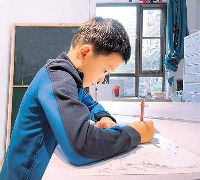 張正昊正在繪制“保護(hù)地球大家園”海報(bào)。