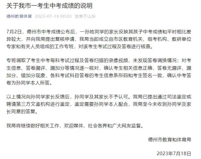 以上情況向?qū)O同學(xué)家長(zhǎng)反饋后,孫同學(xué)及其家長(zhǎng)不予認(rèn)可。德州市教育和體育局已提出通過(guò)司法鑒定或聘請(qǐng)第三方文鑒機(jī)構(gòu)進(jìn)行鑒定,鑒定需要孫同學(xué)本人配合,德州市教育和體育局至今未收到孫同學(xué)及家長(zhǎng)同意的答復(fù)。