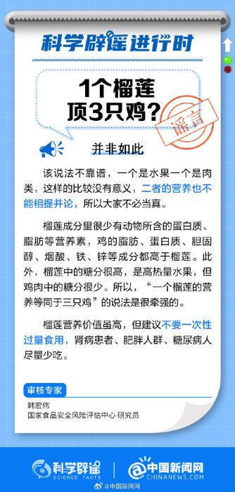 中新網(wǎng)8月15日電 1個榴蓮頂3只雞?該說法不靠譜,一個是水果一個是肉類,這樣的比較沒有意義,二者的營養(yǎng)也不能相提并論。雖然榴蓮營養(yǎng)價值高,但還是建議不要一次性過量食用,腎病患者、肥胖人群、糖尿病人盡量少吃。(來源:@科學辟謠 @中國新聞網(wǎng) )