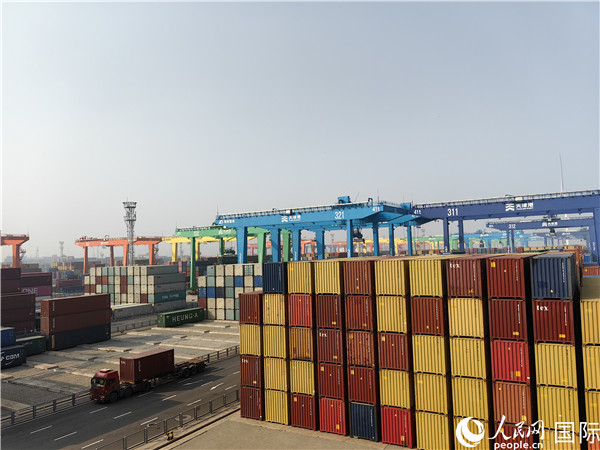 外媒記者探訪(fǎng)天津港北疆港區(qū)C段智能化集裝箱碼頭。人民網(wǎng)記者 符園園攝