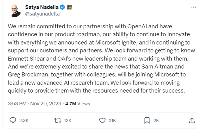 “我們非常高興地宣布,山姆·奧特曼和格雷格·布洛克曼將與同事一起加入Microsoft,領(lǐng)導(dǎo)一個(gè)新的先進(jìn)AI研究團(tuán)隊(duì)。我們期待迅速為他們提供所需的資源以確保他們的成功。”當(dāng)?shù)貢r(shí)間11月20日,微軟CEO納德拉在社交平臺(tái)上宣布被OpenAI董事會(huì)辭退的奧特曼將加入微軟。