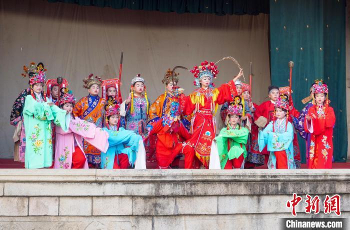 資料圖:安徽省宣城市績溪縣伏嶺鎮(zhèn),徽戲童子班的演員們在戲臺上表演。 張雨生 攝