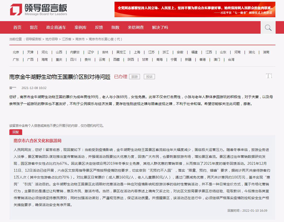 2021年12月8日,網(wǎng)友在人民網(wǎng)“領(lǐng)導(dǎo)留言板”向南京市市長留言稱,南京市金牛湖野生動物王國的票價為成年男性99元,老人與小孩69元,女性免費(fèi)。此舉不僅打擊男性、小孩與老年人參園游玩的積極性,而且對于夫妻以及母親帶孩子一起游玩的群體也不甚友好,不利于公民娛樂與經(jīng)濟(jì)發(fā)展,另外更存在性別歧視與弱者歧視之嫌,不利于社會和諧。