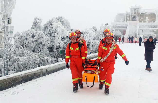 2月23日上午11時(shí)許,半山亭消防救援站副站長(zhǎng)譚琪與 4名消防員一起,戴好防護(hù)鏡、穿好冰爪,攜帶簡(jiǎn)易擔(dān)架、救援繩等救援裝備,從救援站出發(fā),對(duì)沿途的祝融峰、南天門(mén)、會(huì)仙橋等中心景區(qū)進(jìn)行巡邏。