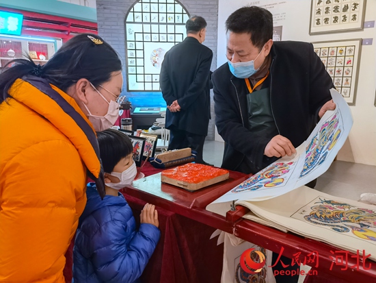 武強(qiáng)木版年畫省級非遺傳承人康英勤向小朋友介紹武強(qiáng)木版年畫。 河北省群眾藝術(shù)館(省非遺保護(hù)中心)供圖