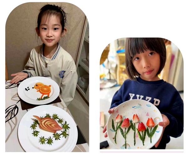 黑芝麻胡同小學(xué)學(xué)生展示和家長(zhǎng)一起制作的水果拼盤(pán)