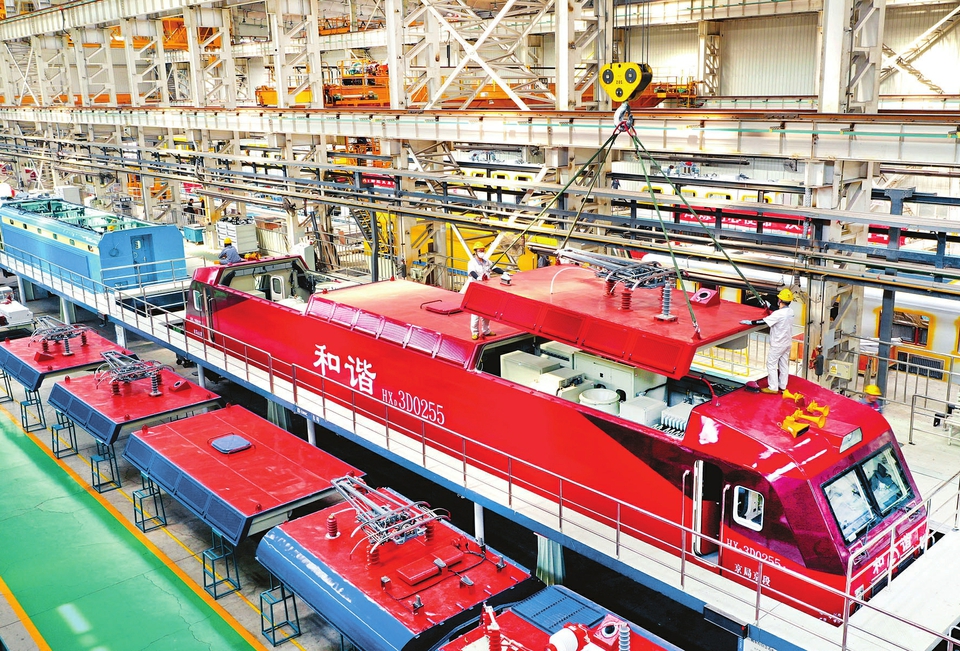 5月20日,在中車太原公司和諧型機車總組裝生產(chǎn)線,工人們正在吊裝電力機車頂蓋。今年以來,中車太原公司克服疫情對生產(chǎn)的影響,強化跟蹤工序進度,全面排查整治安全質(zhì)量薄弱環(huán)節(jié),確保各個工序安全高效、工藝質(zhì)量可靠。目前,公司已實現(xiàn)電力機車檢修產(chǎn)品交直流并舉的重大跨越。(記者劉通攝)