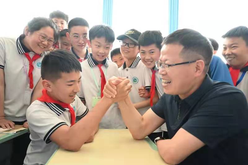人民網(wǎng)莒縣5月26日電 5月26日上午,山東莒縣博雅實(shí)驗(yàn)學(xué)校校長(zhǎng)張迪洲(右)在課間同學(xué)生們一起玩掰手腕游戲,孩子們笑的很開心。
