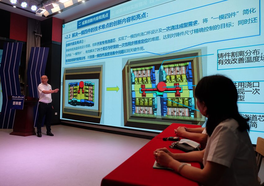 綠色生態(tài)座艙開(kāi)發(fā)研究技術(shù)成果、變壓器套管換油裝置、高效率的一模四件發(fā)動(dòng)機(jī)缸體毛坯關(guān)鍵技術(shù)研究及成果轉(zhuǎn)化應(yīng)用、新能源退役動(dòng)力電池在SGMW制造系統(tǒng)梯次利用項(xiàng)目、重卷機(jī)組關(guān)鍵設(shè)備減時(shí)操作法……參加決賽的項(xiàng)目成果完成人采用PPT講解和現(xiàn)場(chǎng)答辯相結(jié)合的形式進(jìn)行對(duì)決。項(xiàng)目答辯人就項(xiàng)目立項(xiàng)背景、成果創(chuàng)新內(nèi)容和亮點(diǎn)、成果采納實(shí)施情況、經(jīng)濟(jì)效益、社會(huì)效益、獲獎(jiǎng)情況等進(jìn)行了介紹,并圍繞創(chuàng)新成果的創(chuàng)新性、原創(chuàng)性、成果應(yīng)用成熟性、質(zhì)量可靠性、成果的先進(jìn)程度、成果技術(shù)水平和難易程度、成果提高勞動(dòng)生產(chǎn)效率作用、經(jīng)濟(jì)效益、社會(huì)效益、成果的適用范圍和推廣前景等方面回答評(píng)委的提問(wèn)。
