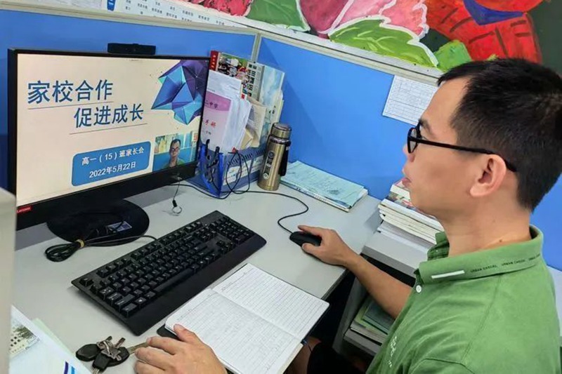 5月22號(hào)(捐獻(xiàn)造血干細(xì)胞的前一天),韓熠光在年級辦公室召開線上家長會(huì)。??谑械诙袑W(xué)供圖