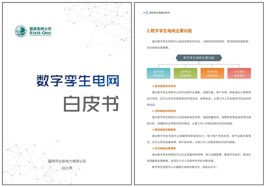 2021年7月,國(guó)網(wǎng)河北電科院聯(lián)合多家單位編制完成并發(fā)布了國(guó)內(nèi)電網(wǎng)領(lǐng)域首個(gè)《數(shù)字孿生電網(wǎng)白皮書》。白皮書歸納總結(jié)了雄安數(shù)字孿生建設(shè)成果,系統(tǒng)闡述了數(shù)字孿生電網(wǎng)的主要功能、體系架構(gòu)以及維護(hù)管理方式等內(nèi)容,創(chuàng)造性地提出了數(shù)字孿生電網(wǎng)的技術(shù)架構(gòu)和技術(shù)實(shí)現(xiàn)方式,對(duì)今后數(shù)字孿生技術(shù)在電網(wǎng)領(lǐng)域的探索應(yīng)用具有較強(qiáng)的指導(dǎo)意義。