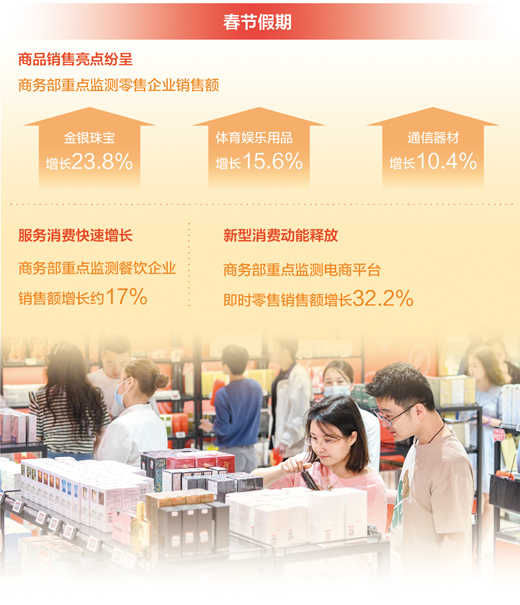 數(shù)據(jù)顯示,春節(jié)假期商品銷售亮點紛呈。春節(jié)假期,節(jié)慶商品、國貨潮品、綠色智能產(chǎn)品等持續(xù)旺銷。商務部重點監(jiān)測零售企業(yè)金銀珠寶、體育娛樂用品、通信器材銷售額同比分別增長23.8%、15.6%和10.4%。