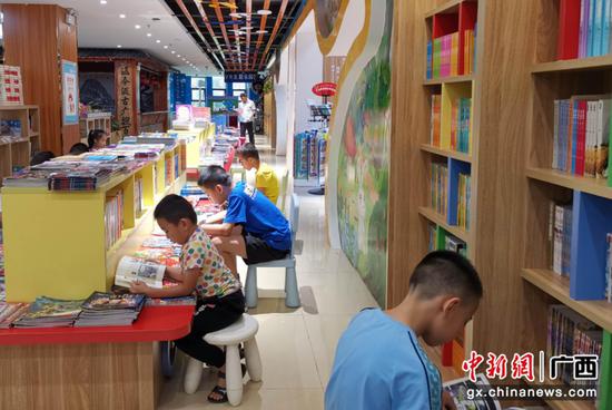 8月3日,在靖西市國門書店里,中小學生讀者在選購、閱讀圖書。據(jù)了解,自放暑假以來,每天都有許多學生在家長的陪伴下來到書店,度過快樂、充實的假期。黃安忠 攝