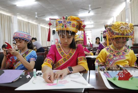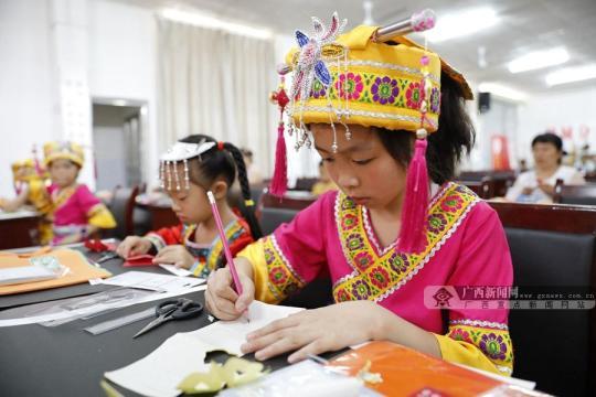 仫佬族學(xué)生在仫佬族剪紙技藝傳承人的指導(dǎo)下,認真地練習(xí)剪紙。廣西新聞網(wǎng)通訊員 廖光福攝
