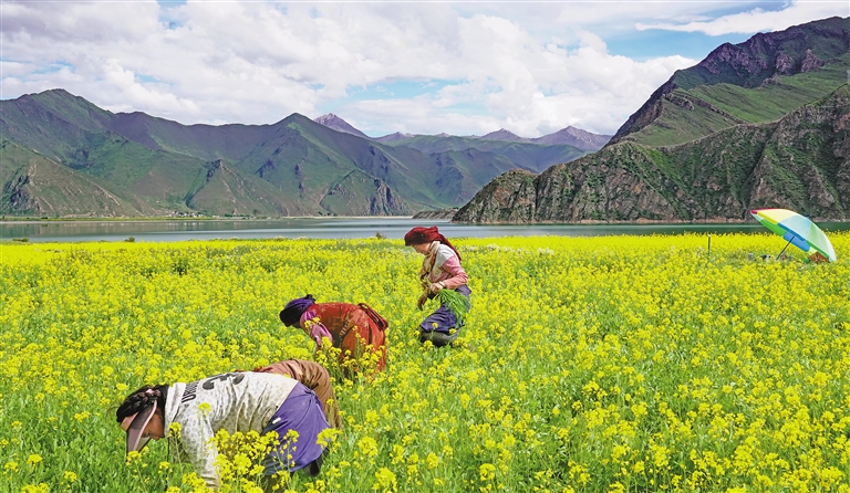 圖為墨竹工卡縣尼瑪江熱鄉(xiāng)幫達(dá)村村民在油菜花田里拔雜草。記者 唐斌 通訊員 洛克 攝