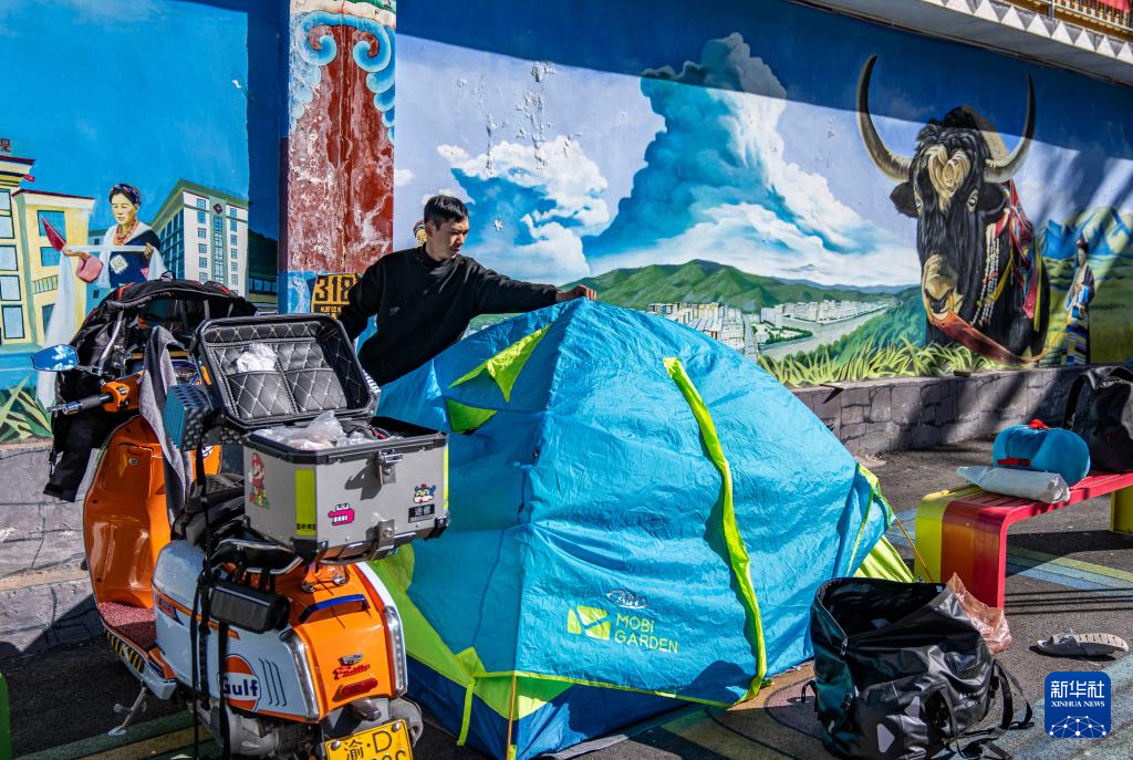 來(lái)自重慶的游客張靜在西藏芒康縣如美鎮(zhèn)拉烏村整理自己的帳篷(10月20日攝)。新華社記者 孫非 攝