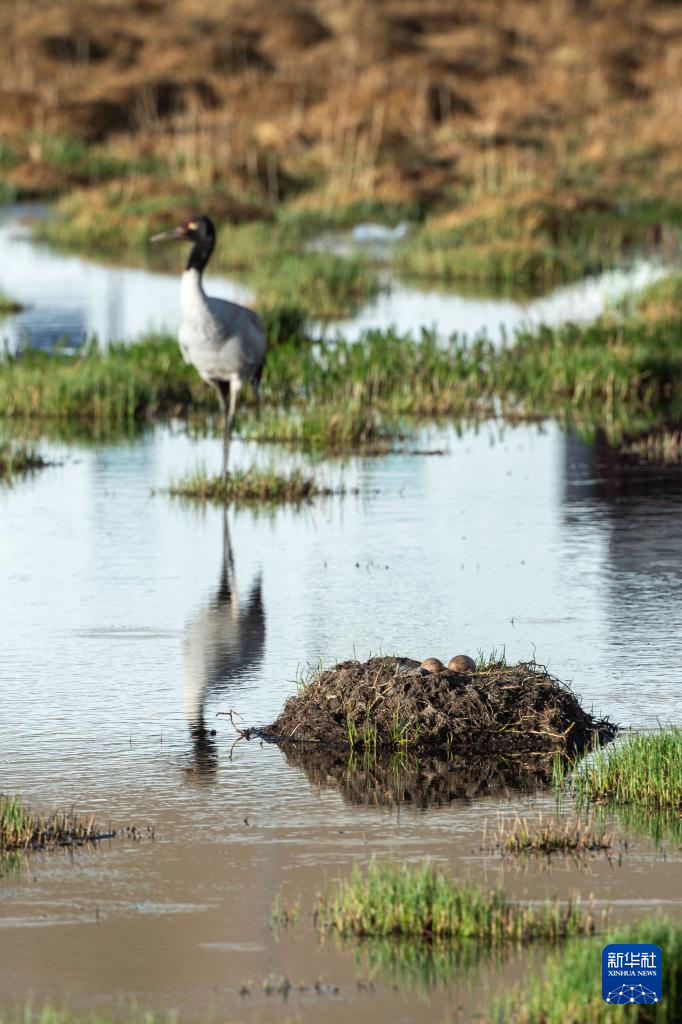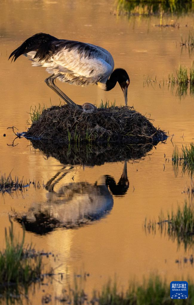 黑頸鶴在濕地孵蛋(6月7日攝)。新華社記者 姜帆 攝