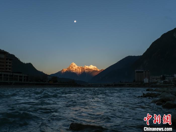12月17日清晨日出時分,西藏波密縣出現(xiàn)“日照金山”與月亮同框的景色。中新社記者 江飛波 攝