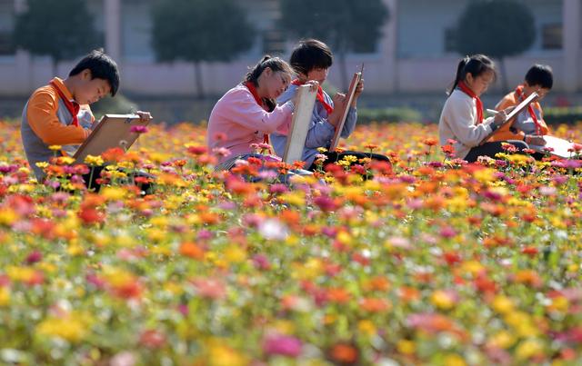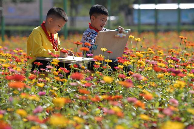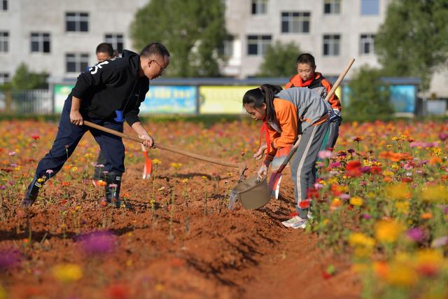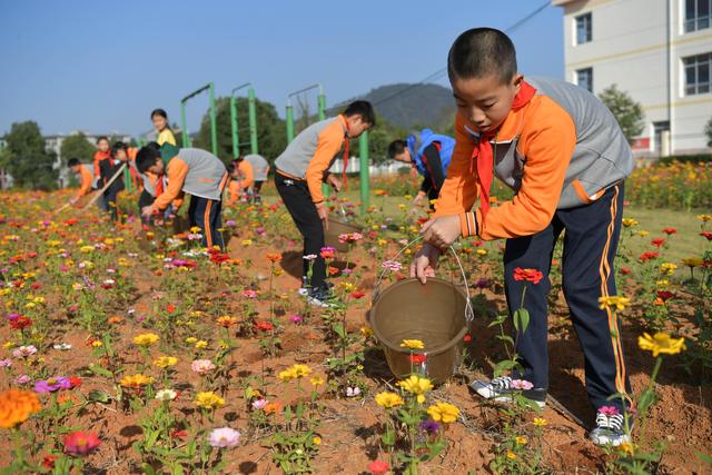 今年暑假剛剛到任江西省宜春市袁州區(qū)寨下鎮(zhèn)中心小學(xué)的殷大福校長(zhǎng)看著教學(xué)樓前一大片長(zhǎng)滿雜草的荒地,希望能在上面做點(diǎn)文章,讓孩子們課后有個(gè)休閑活動(dòng)的好去處。于是,他和老師們一起平整荒地,種下百日草的種子,開(kāi)辟出花田和草坪。如今,昔日的荒地上已綻放出一片絢爛的花海,學(xué)生們的學(xué)習(xí)生活因此更加豐富多彩。美術(shù)課、十字繡興趣小組的同學(xué)紛紛到花田邊寫(xiě)生、采風(fēng),孩子們?cè)诰G地里玩耍訓(xùn)練。每周,殷大福校長(zhǎng)還會(huì)組織不同班級(jí)的學(xué)生下田勞動(dòng),為鮮花松土、施肥、澆水,讓他們親身體驗(yàn)守護(hù)生活中美好的滋味。呵護(hù)、陪伴、欣賞……一顆顆真善美的種子在學(xué)生們的心底悄然種下。