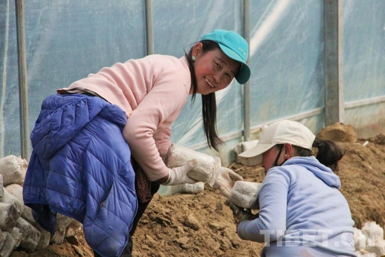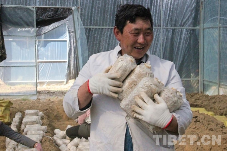 圖為尼瑪指導(dǎo)村民種植靈芝菌包