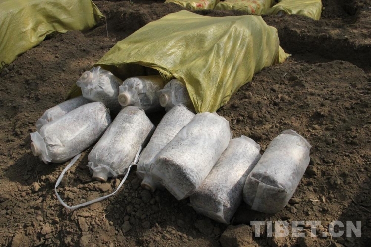 圖為村民正在種植靈芝菌包