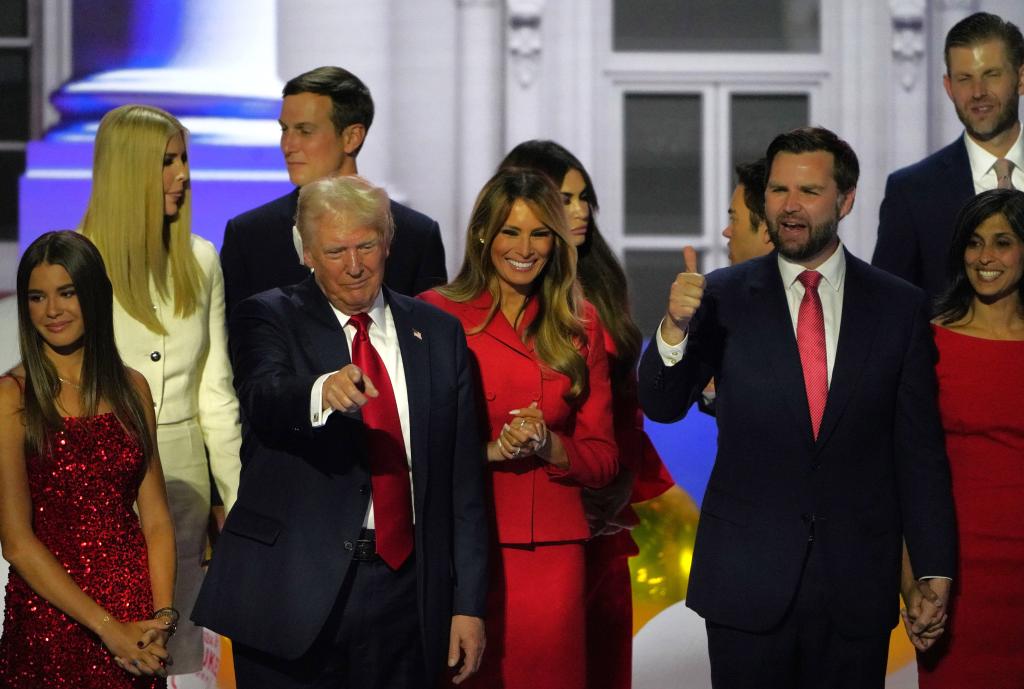 7月18日,美國前總統(tǒng)特朗普(前排左二)和共和黨副總統(tǒng)候選人萬斯(前排右二)在共和黨全國代表大會(huì)上向觀眾致意。新華社記者 吳曉凌 攝