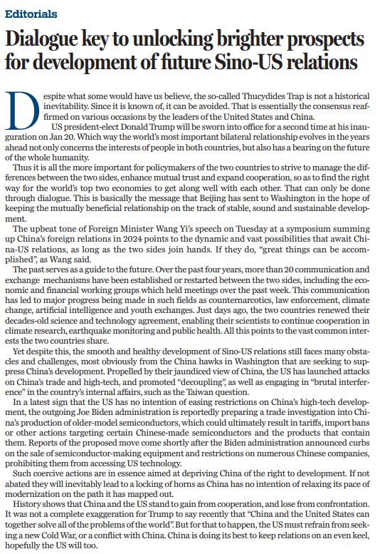 因此,雙方應(yīng)當(dāng)努力管控分歧、增信釋疑、拓展合作,為世界前兩大經(jīng)濟(jì)體開(kāi)辟友好相處、共同發(fā)展的道路。這只能通過(guò)對(duì)話溝通來(lái)實(shí)現(xiàn)。