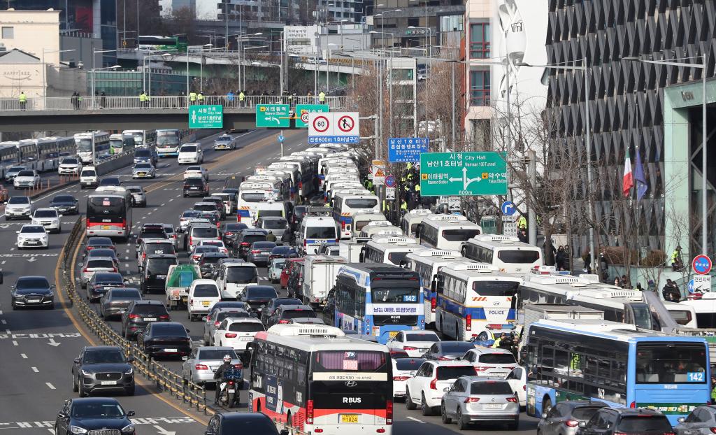 1月3日,大量警方車輛停在韓國首爾龍山區(qū)漢南洞的總統(tǒng)官邸附近。新華社記者姚琪琳攝