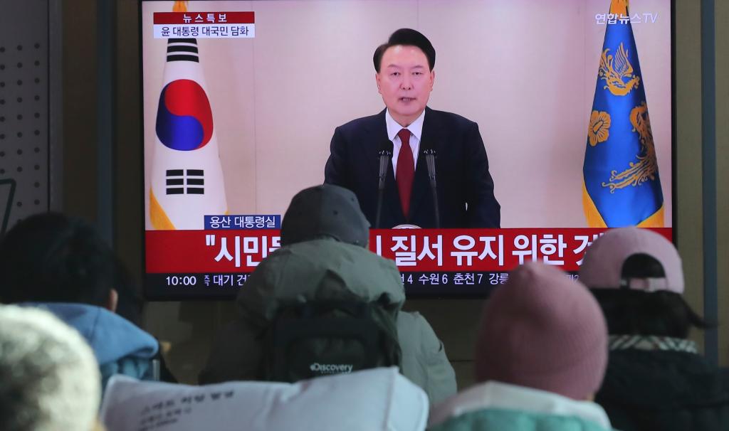 2024年12月12日,在韓國首爾火車站,韓國民眾觀看總統(tǒng)尹錫悅對國民談話的電視直播。新華社記者姚琪琳攝
