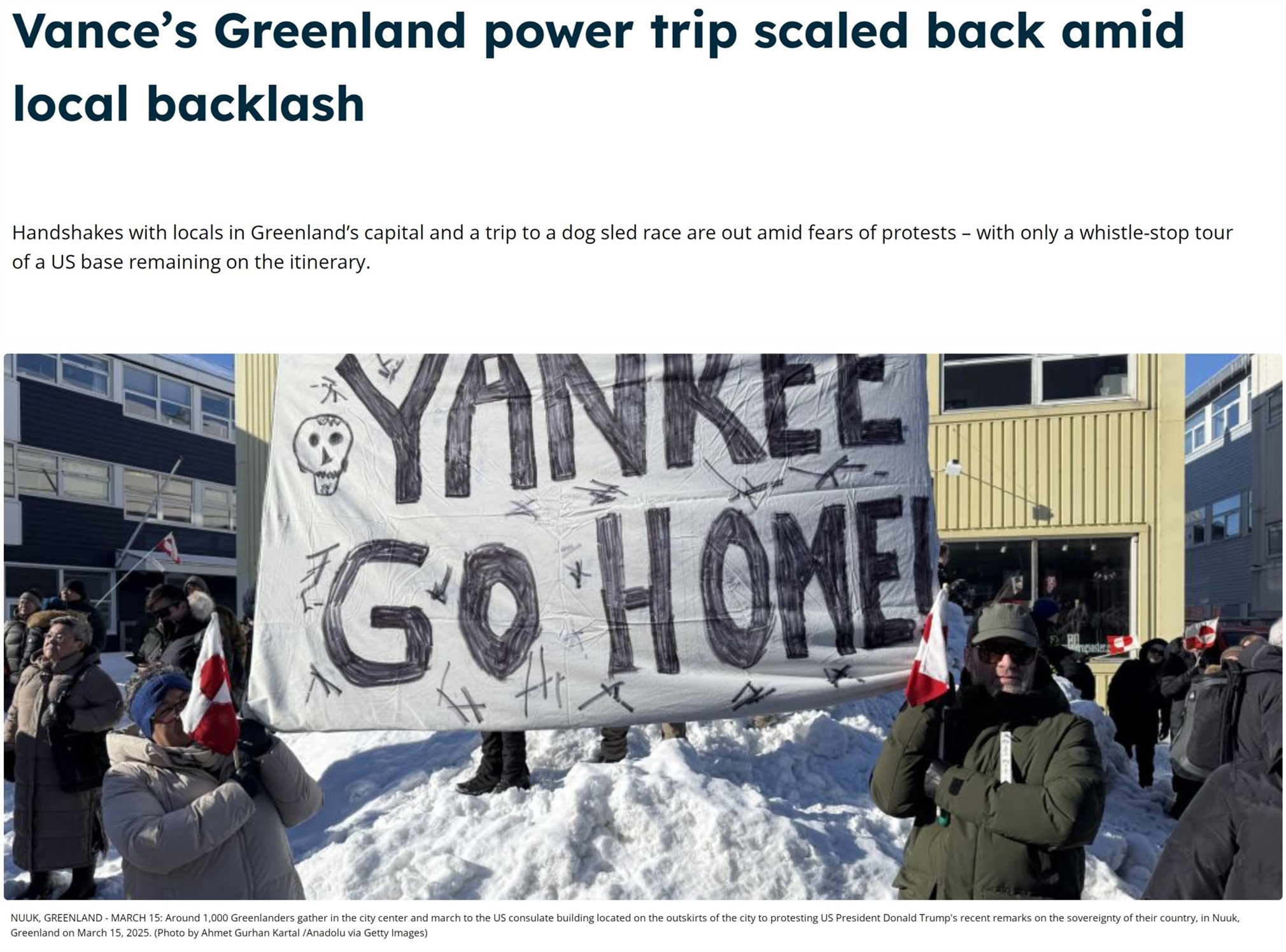 迫于輿論壓力,萬(wàn)斯的夫人烏莎·萬(wàn)斯此行不得不取消了去格陵蘭島首府努克和第二大城市錫西米尤特參加相關(guān)文化活動(dòng)的計(jì)劃。