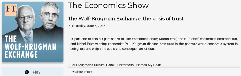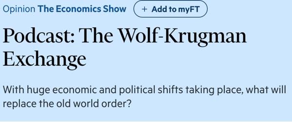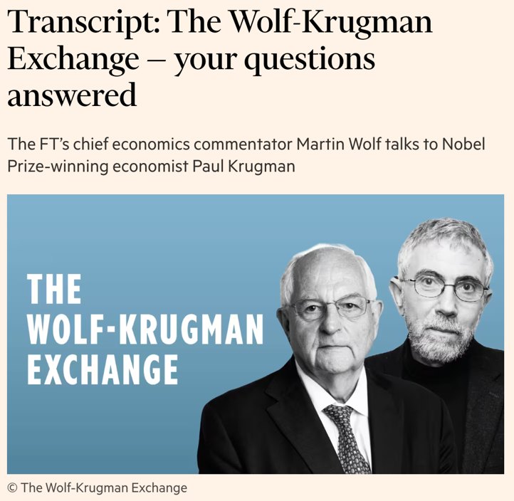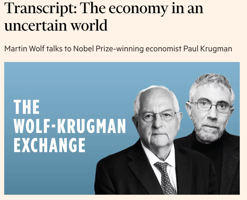 △《金融時報》在對完整六期訪談的總結報道中,深入總結了克魯格曼與沃爾夫兩人對當前制度退化、全球治理、選民心理的批評視角