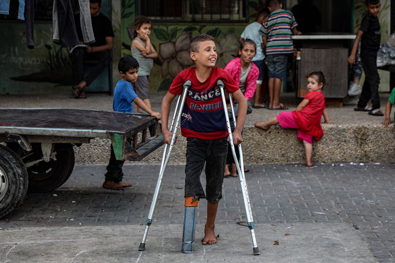 10月5日,年僅10歲的少年拉提卜·阿布·卡里克在加沙地帶中部代爾拜拉赫附近的聯(lián)合國臨時(shí)安置機(jī)構(gòu)內(nèi)拄著拐杖行走。在數(shù)月前的一次以色列空襲中,拉提卜失去了右腿致殘,他的母親和兄弟也在襲擊中身亡。 新華社發(fā)(里澤克·阿卜杜勒賈瓦德攝)
