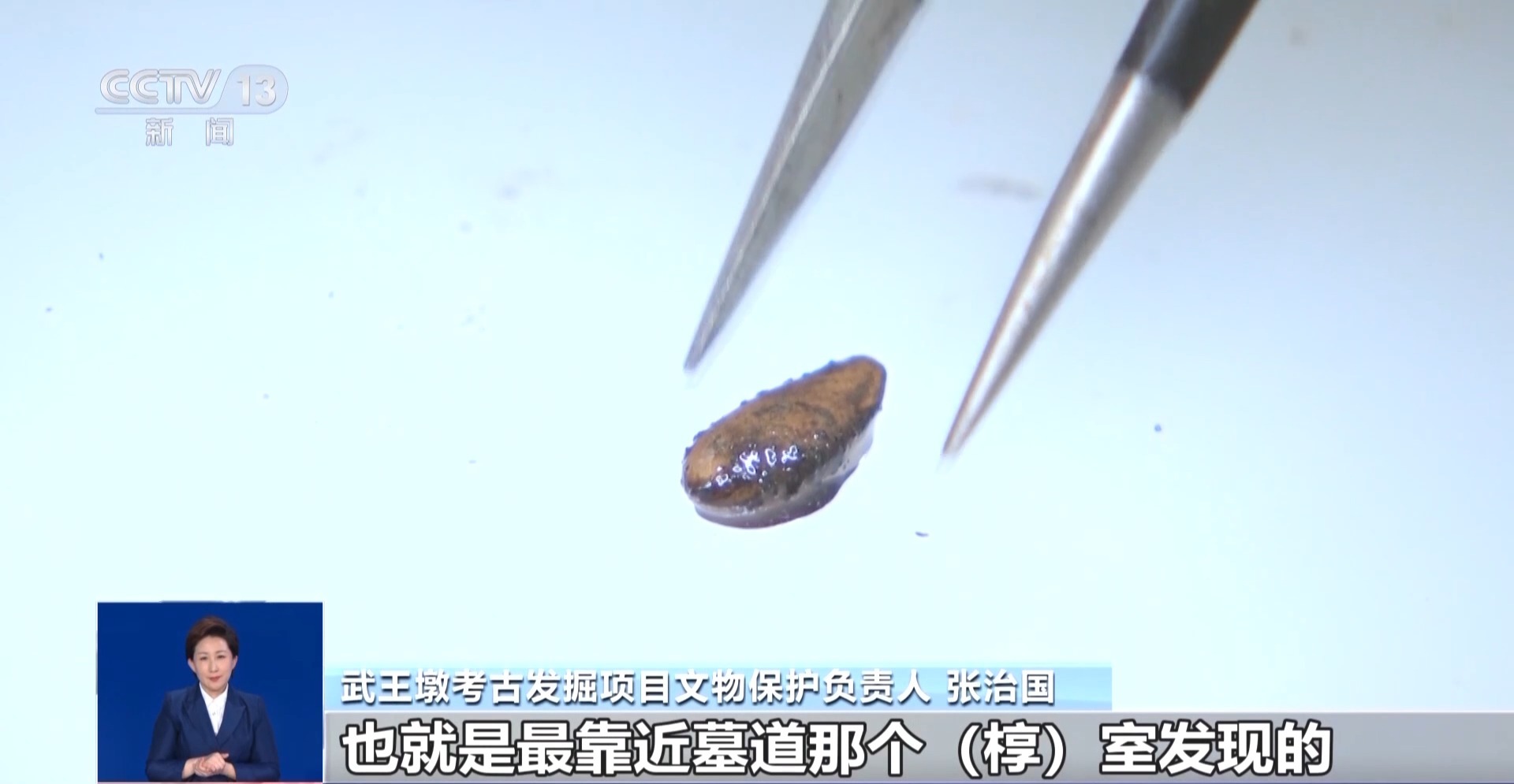 武王墩考古發(fā)掘項(xiàng)目文物保護(hù)負(fù)責(zé)人 張治國(guó):發(fā)現(xiàn)大部分的這個(gè)里面都是一些樹(shù)葉,然后還有果核,可能還有一些草編的痕跡,目前初步鑒定出來(lái)的有甜瓜籽,然后還有一些梅核。