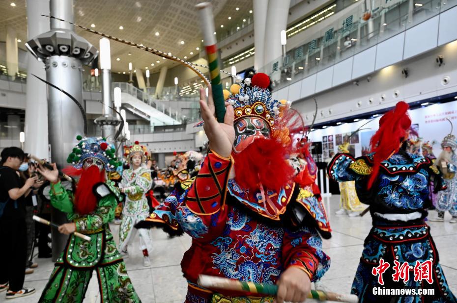 圖為英歌舞表演吸引大批旅客觀(guān)看。