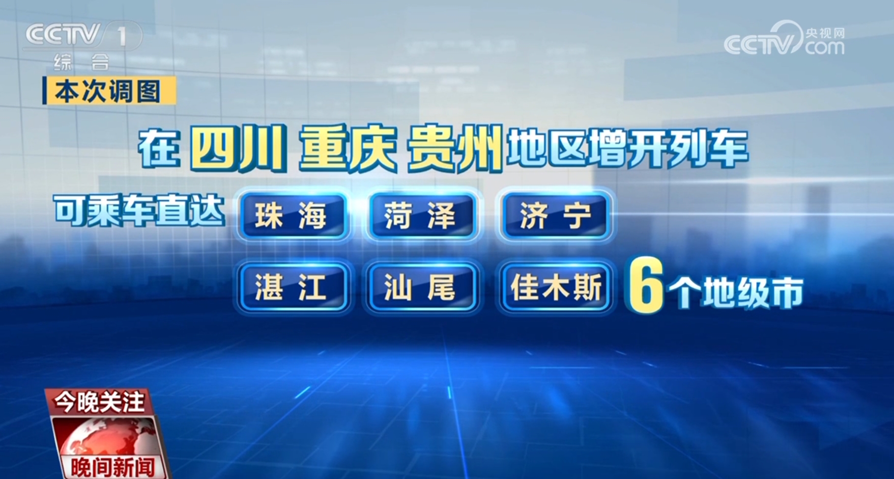 本次調(diào)圖,在鄭州、武漢、長沙等城市間增開復(fù)興號動車組標(biāo)桿列車28列,進一步壓縮了中部地區(qū)省會城市間的時空距離;在四川重慶貴州地區(qū)增開列車,旅客從川渝貴三地可乘車直達珠海、菏澤、濟寧、湛江、汕尾、佳木斯6個地級市。此外,首開太原至深圳的動車組列車,旅行時間為8小時17分,較普速旅客列車壓縮了27小時57分。