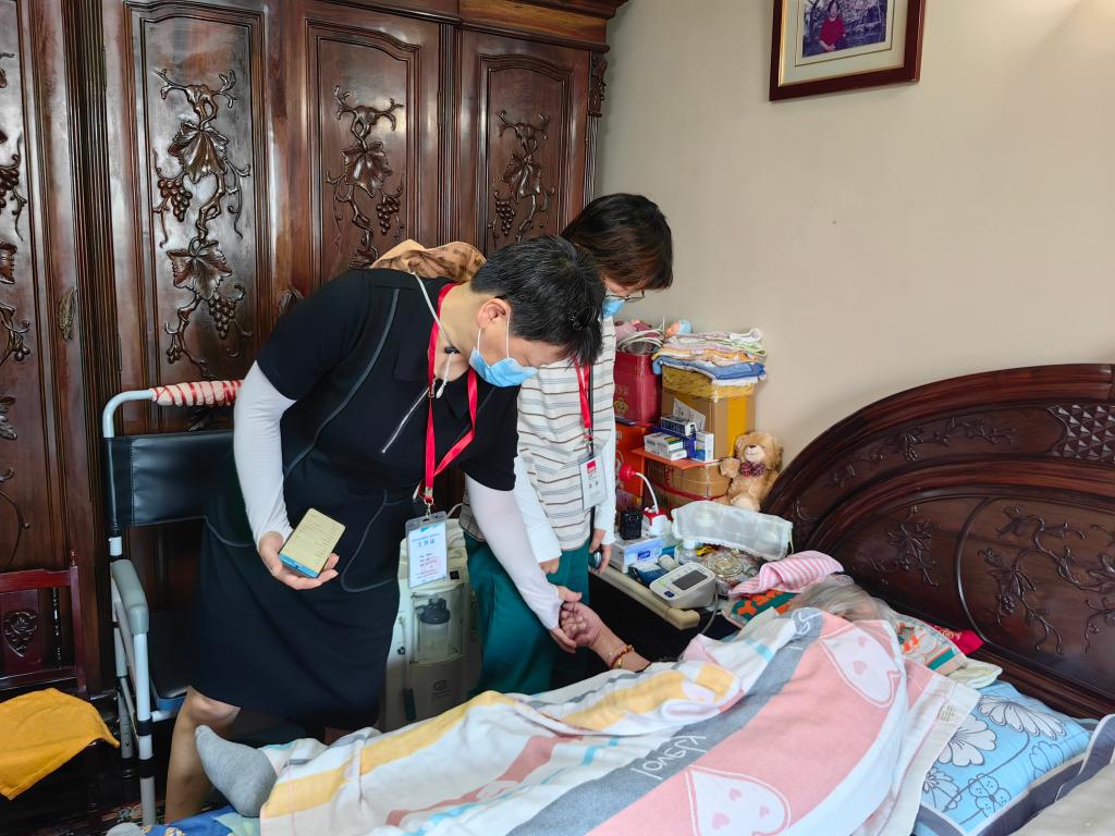 76歲的劉爺爺腦溢血后部分肢體偏癱,同時(shí)患有一些基礎(chǔ)性老年病?!耙葴y(cè)量老人生命體征是否平穩(wěn),再進(jìn)行助浴,其間也要隨時(shí)關(guān)注老人的狀態(tài)?!彼f。