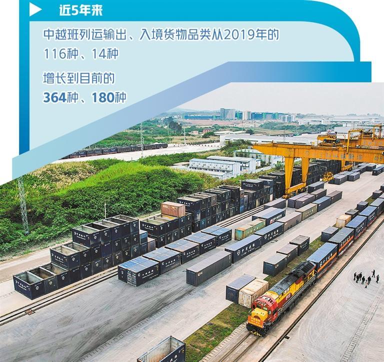 數(shù)據(jù)表明,高效、實(shí)惠、便捷的中越班列已得到市場認(rèn)可。近5年來,中越班列運(yùn)輸出、入境貨物品類從2019年的116種、14種,增長到目前的364種、180種。中越班列集貨地已覆蓋廣西及周邊省份20多個(gè)地市,跨境貨物運(yùn)輸覆蓋越南、老撾、泰國等多個(gè)東盟國家。