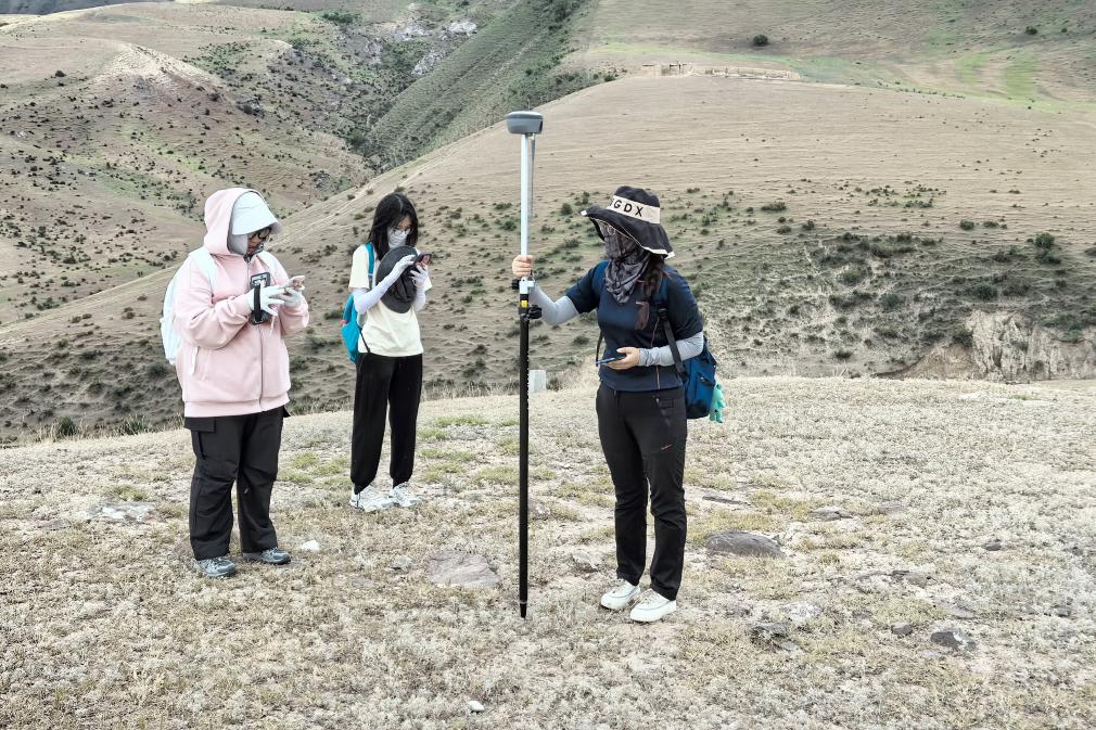 尼勒克縣第四次全國文物普查工作隊隊員魏中暢(左一)手持RTK測量儀,復(fù)核文物信息。新華社記者 白志強 攝