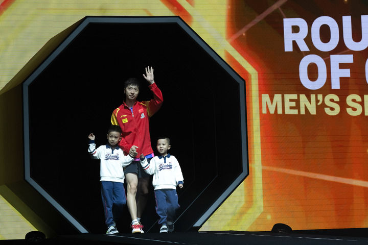 9月30日,馬龍帶著他的兒子們步入賽場。當日,在北京舉行的2024年世界乒乓球職業(yè)大聯(lián)盟(WTT)中國大滿貫男單首輪比賽中,中國選手馬龍3比0戰(zhàn)勝英格蘭選手利亞姆·皮切福特,晉級32強。新華社記者 肖藝九 攝