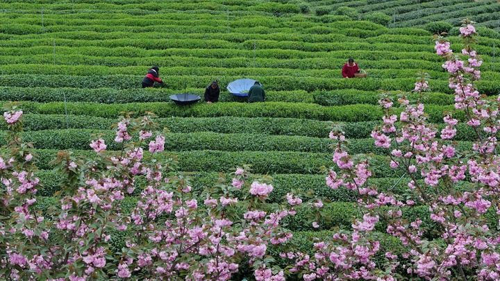 2024年4月6日,村民在貴州省遵義市鳳岡縣永安鎮(zhèn)田壩社區(qū)茶葉基地采摘春茶(無(wú)人機(jī)照片)。新華社發(fā)(王超 攝)