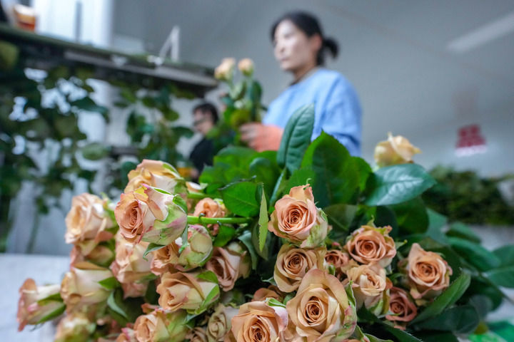 2024年8月23日,在云南晉寧花卉產(chǎn)業(yè)現(xiàn)代化示范園采后處理中心,花農(nóng)將鮮切花放入自動(dòng)分揀流水線上進(jìn)行分揀。新華社記者 陳欣波 攝