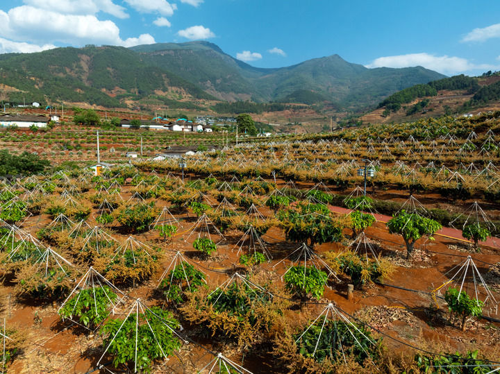 這是2024年4月9日拍攝的四川省攀枝花市米易縣新山傈僳族鄉(xiāng)中山村芒果產(chǎn)業(yè)園(無(wú)人機(jī)照片)。新華社記者 沈伯韓 攝