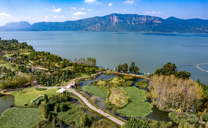 這是2024年10月18日拍攝的云南省昆明市滇池及星海半島濕地公園(無(wú)人機(jī)照片)。新華社記者 陳欣波 攝