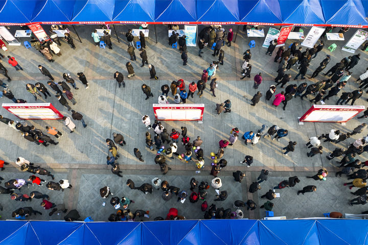 2023年1月31日,在四川省閬中市人民廣場(chǎng),求職者參加?xùn)|西部勞務(wù)協(xié)作暨春風(fēng)行動(dòng)大型招聘會(huì)(無(wú)人機(jī)照片)。新華社發(fā)(王玉貴 攝)