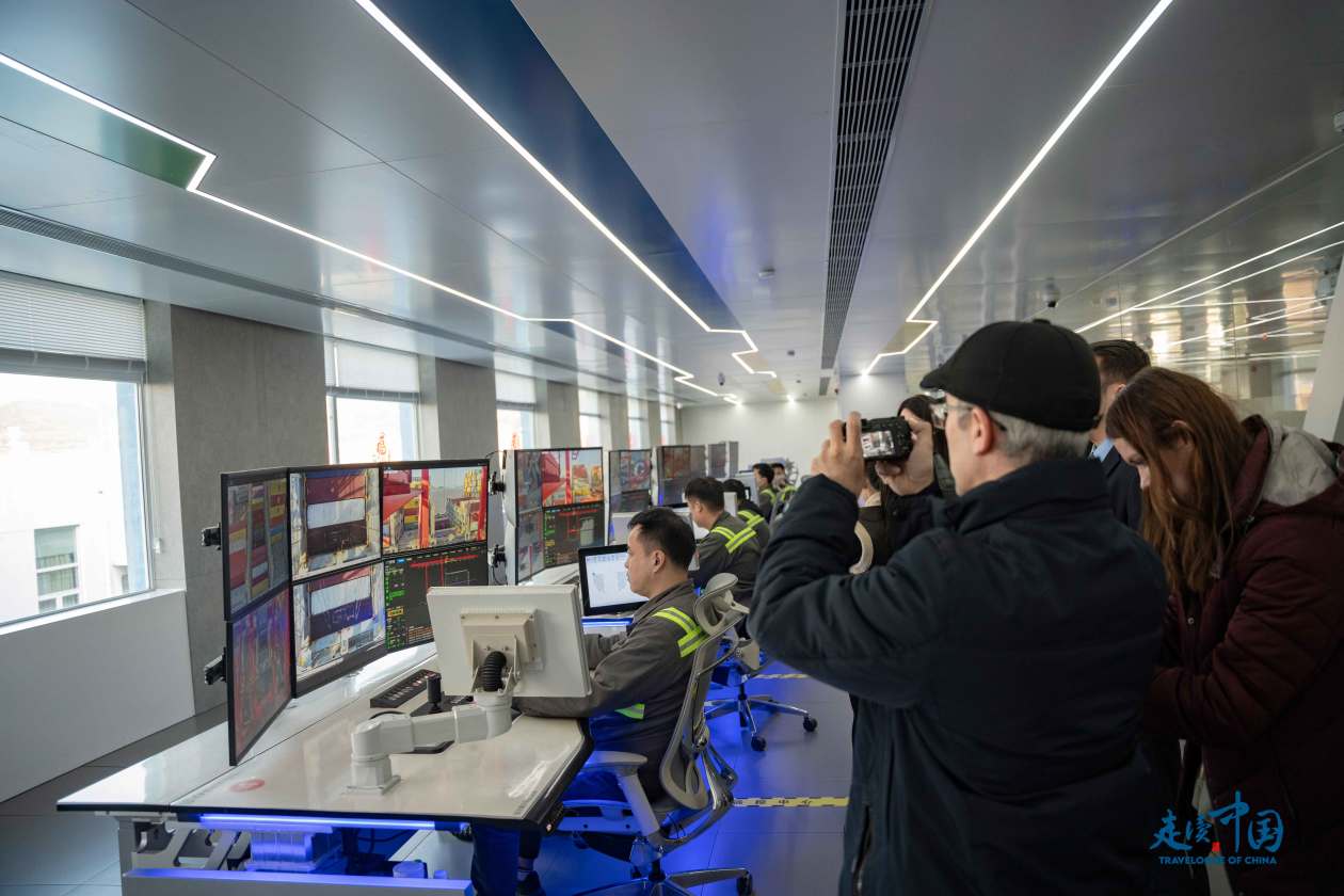 外國記者參觀寧波舟山港穿山港區(qū)集裝箱碼頭遠控中心
