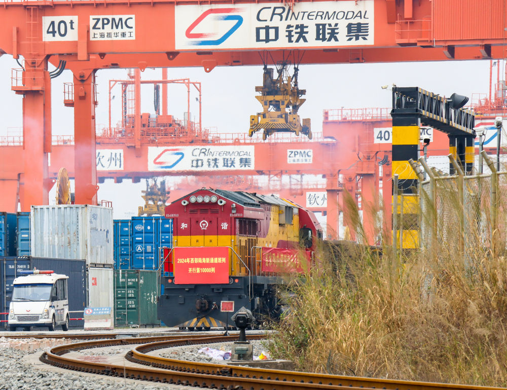 2024年西部陸海新通道班列第10000列發(fā)車(chē)。(北部灣港集團(tuán)供圖)