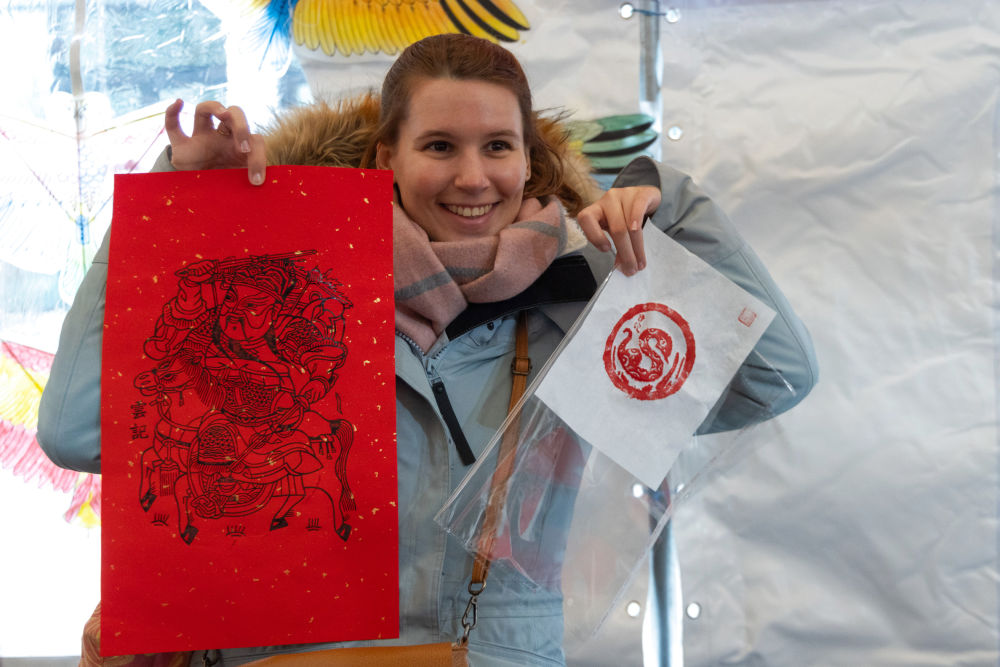 1月18日,一名女子在匈牙利首都布達(dá)佩斯舉行的新春廟會(huì)活動(dòng)上手持木版年畫(huà)留影。新華社發(fā)(弗爾季·奧蒂洛攝)