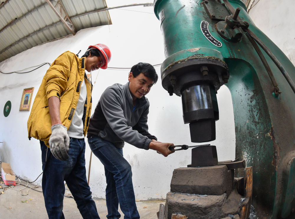 在孜托鎮(zhèn)加日扎村民族手工藝品加工合作社里,寸昆杰向徒弟們示范洛隆藏刀的鍛造工序,他是首位掌握洛隆藏刀技藝的白族人:隨著鼓風機吹動,室內一股熱浪撲面而來,被燒得通紅的刀片在空氣錘的敲打下火花四濺……